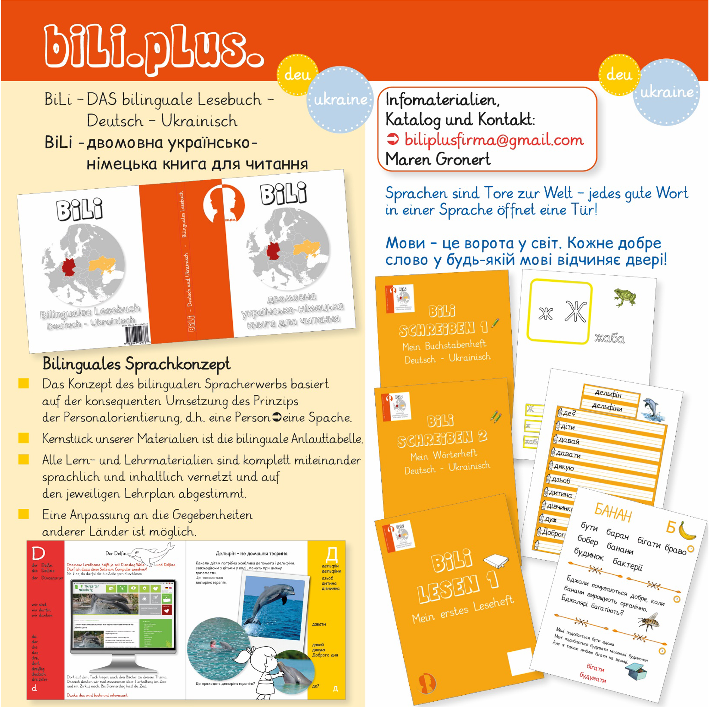 Unsere zweisprachigen Lern- und Lehrbücher wurden für den Unterricht entwickelt. Für den Unterricht in Klassen, die mit zwei Lehrern zwei Sprachen gleichzeitig erwerben bzw. lernen. Sie sind im schulischen Einsatz und bestehen dort seit Jahren den Alltagstest. Unsere Bücher lassen sich natürlich auch im häuslichen Gebrauch einsetzen, gerade zwei- und mehrsprachige Familien werden die Vielfalt und das Nebeneinander der Sprachen und Kulturen schätzen. Die Bildimpulse und Textbeispiele ermöglichen individuelles Eingehen auf den Lernprozess eines jeden Kindes. In den zweisprachigen Büchern unseres biLi-Konzeptes finden sich keine Aufgaben und Fragen, diese ergeben sich aus der gemeinsamen Arbeit aller am Lernprozess beteiligten Menschen. In den dazugehörigen Arbeitsheften gibt es gezielte Angebote und Aufträge, das Exemplarische der Bücher zu vertiefen, zu ergänzen, zu hinterfragen, gegenüberzustellen, intensiv zu lernen.... Wir laden Sie ein, die vielfältigen Materialien des biLi-Konzeptes kennenzulernen. Die von Ihnen gesuchte Sprachkombination ist nicht dabei? Kein Problem, nehmen Sie Kontakt mit uns auf, wir finden eine Lösung.